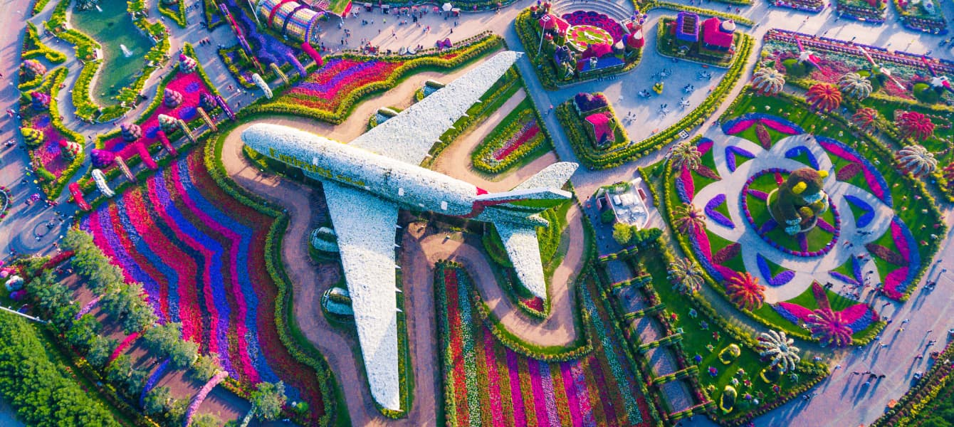 في إنجاز فني غير مسبوق، تُعرض نسخة بالحجم الحقيقي من طائرة Emirates A380 مغطاة بالكامل بالزهور والنباتات الحية. استغرق تنفيذ هذا العمل أكثر من 180 يومًا، ويُعد أكبر تركيب زهري في العالم، حيث استخدم فيه أكثر من 500,000 زهرة ونبتة. هذا المعلم يُجسّد روح الابتكار الإماراتية، ويُعد رمزًا للتفوّق في التصميم والهندسة النباتية.