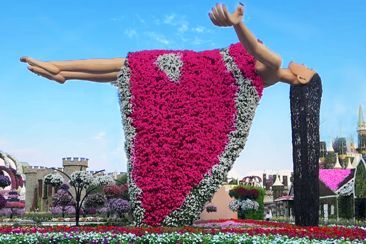 واحدة من أكثر التركيبات الفنية إثارة، حيث تظهر امرأة معلّقة في الهواء، ترتدي ثوبًا من البتونيا الوردية والبيضاء، وذراعاها ممدودتان نحو السماء. هذه التركيبة تُجسّد الخيال البصري وتُضفي على المكان طابعًا سرياليًا يُثير الإعجاب، وتُعد من أكثر النقاط تصويرًا في الحديقة.