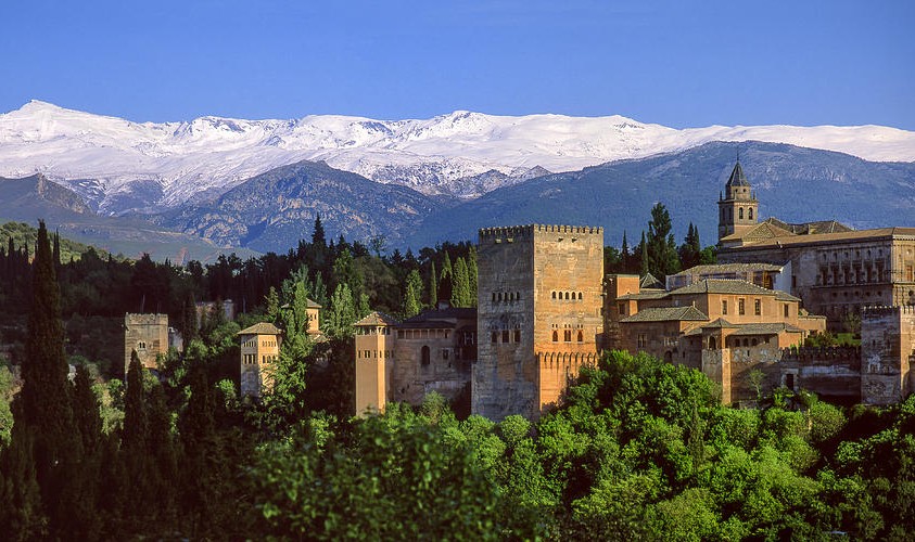 يقع قصر الحمراء في غرناطة بإسبانيا على تلة تطل على المدينة، ومحاط بقمم سييرا نيفادا الثلجية. في الشتاء، يتشكل تناقض بصري مدهش بين دفء العمارة الأندلسية وزخارفها المعقدة وبرودة الضباب والأجواء الجبلية.