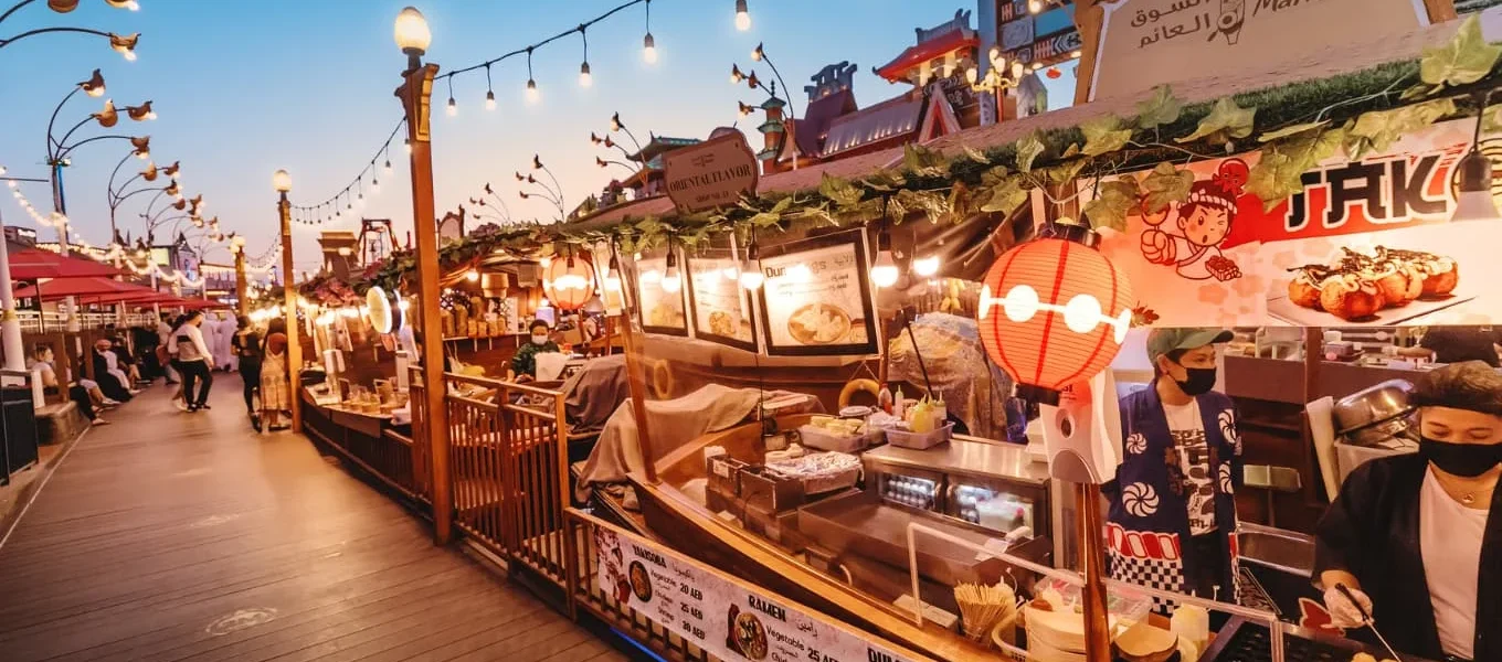القرية العالمية هي أيضاً مجتمع من النكهات العالمية. الملايين من الوجبات تُقدَّم سنويًا من أكثر من 250 منفذًا للطعام، تتراوح بين أكشاك الطعام السريع، مقاهي الشارع، وحتى مطاعم مُختارة تقدّم أطباقًا فاخرة من مختلف القارات. تُعد تجربة التذوق بين الجناح والطرف المشيخي فرصة لاكتشاف أطباق جديدة، توليفات غير معتادة، وحلاوة الثقافات تتجسد في كل لقمة.