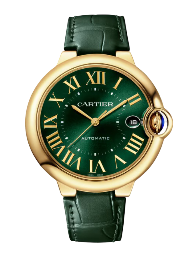تتميز ساعة كارتييه بالون بلو WGBB0062 بعلبة من الذهب الأصفر عيار 18 وكوارتز أخضر يعكس أناقة لا مثيل لها، مع حزام من جلد التمساح الأخضر يضيف لمسة فاخرة. تصميمها الأنيق يجعلها خياراً مثالياً للرجل العصري الباحث عن الفخامة الكلاسيكية مع لمسة من الجرأة.