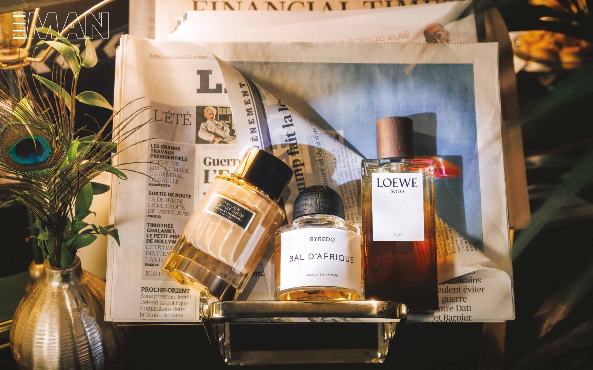 عطر Stallion Leather Suede من Carolina Herrera؛ عطر Bal d’Afrique من Byredo؛ عطر Solo Elixir من Loewe