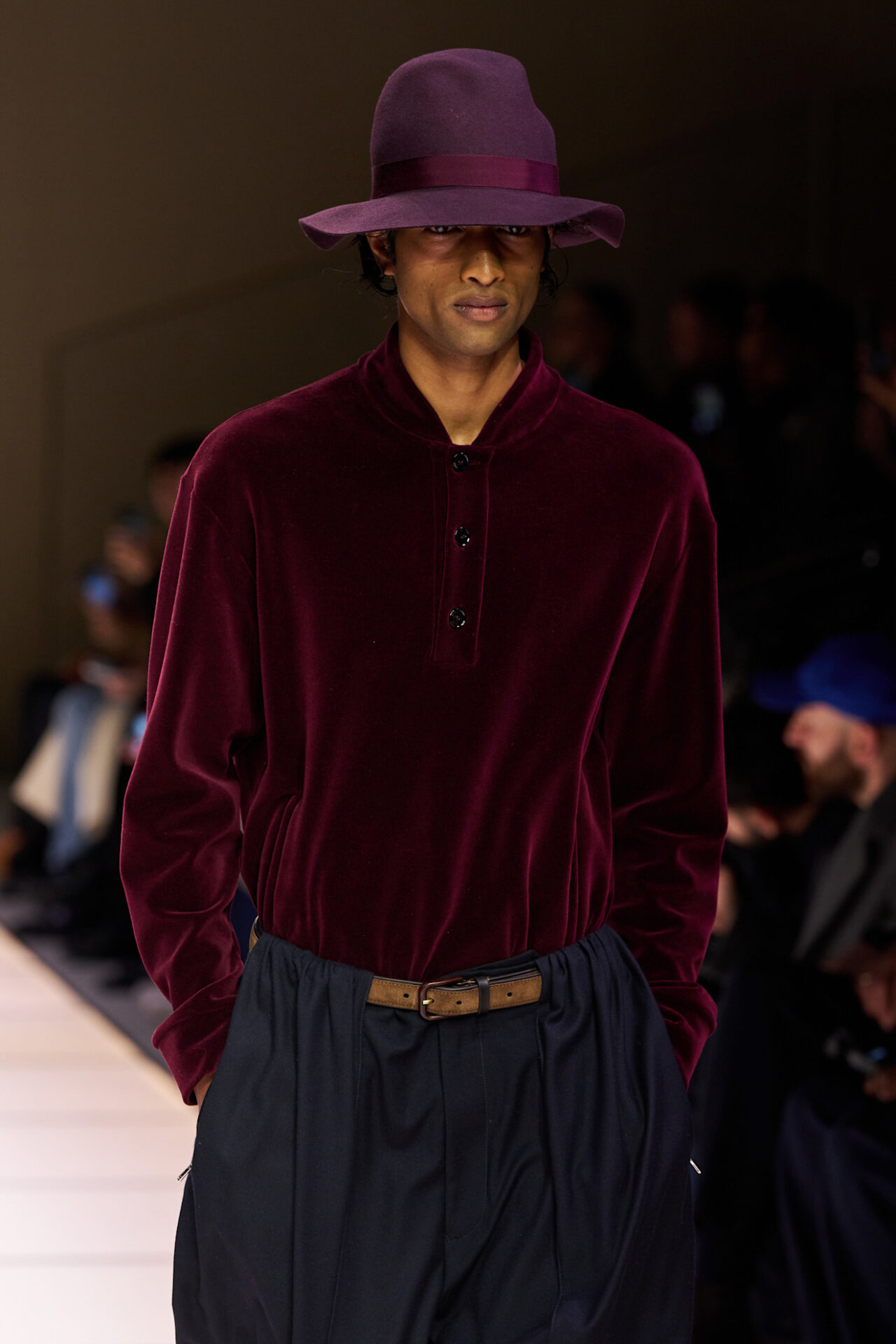 يجسد المخمل البرغندي قمة الفخامة في تشكيلة جورجيو أرماني، حيث تظهر القمصان المخملية بلمعان خافت يعكس دفء الشتاء. يضفي تنسيق اللون البرغندي مع القبعات ذات التدرجات البنفسجية لمحة فنية غير تقليدية على إطلالات عيد الحب. يمنح هذا المزيج اللوني عمقًا بصريًا جذابًا، خاصّةً عند اختيار خامات تنسدل بنعومة على الجسد، مما يعزز من فخامة الحضور بأسلوب يحاكي كلاسيكيات الموضة الإيطالية الراقية.