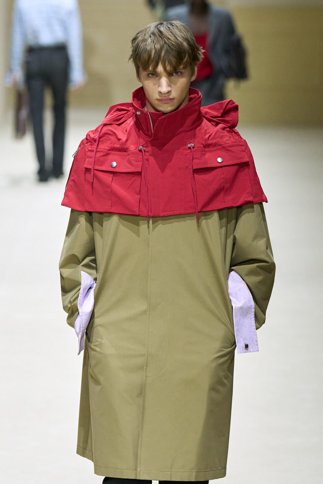 تهيمن المعاطف المزركشة بالألوان الدافئة على منصة “دريس فان نوتن”، حيث تتداخل أشكال المعينات (losanges) بتناغم لوني فريد. تمنح هذه القطع طابعًا هندسياً لافتًا ضمن إطلالات عيد الحب، إذ يختلط الأحمر بالألوان الترابية ليشكل درعًا من الأناقة الدافئة. يوفر حجم المعطف الفضفاض مع النقوش الهندسية توازنًا مثاليًا بين الراحة والفن، ويسمح ببروز الهوية الشخصية من خلال تفاصيل دقيقة تحاكي التراث الثقافي بلمسة معاصرة.