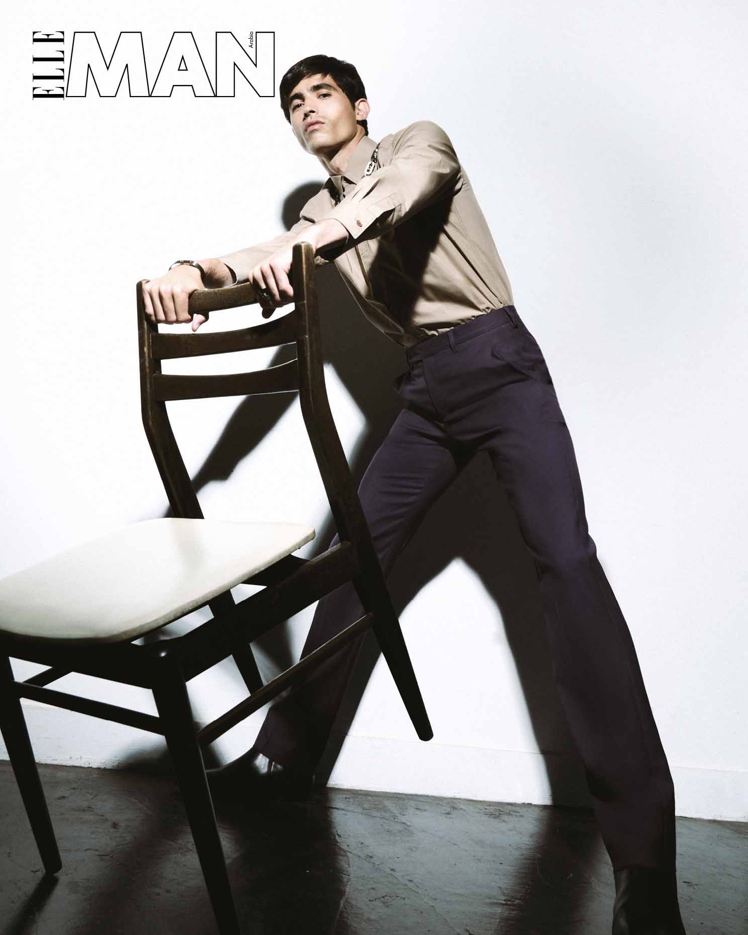 قميص وبنطلون من Paul Smith؛ سلسلة من الذهب والألماس من Messika؛ حذاء من Manolo Blahnik