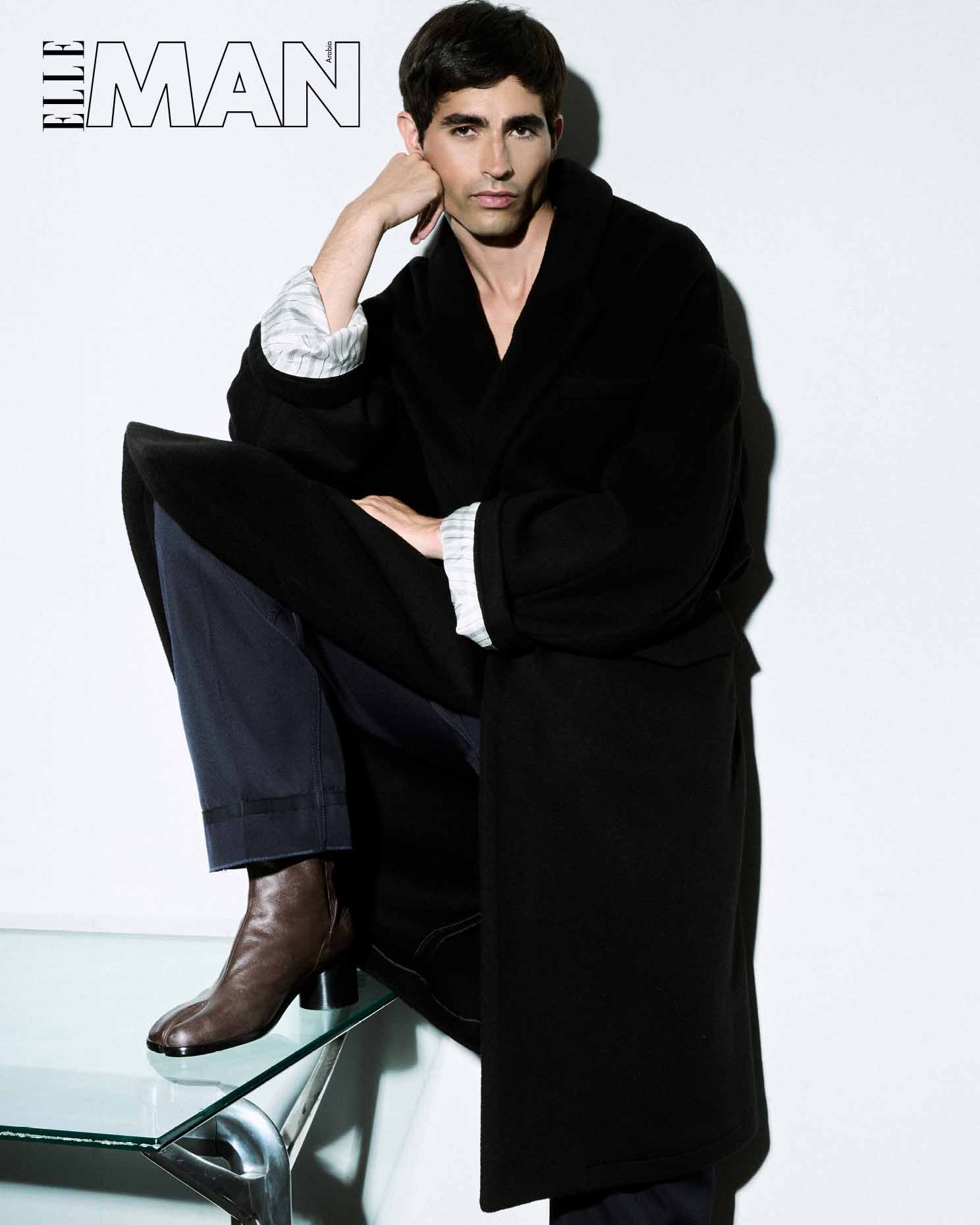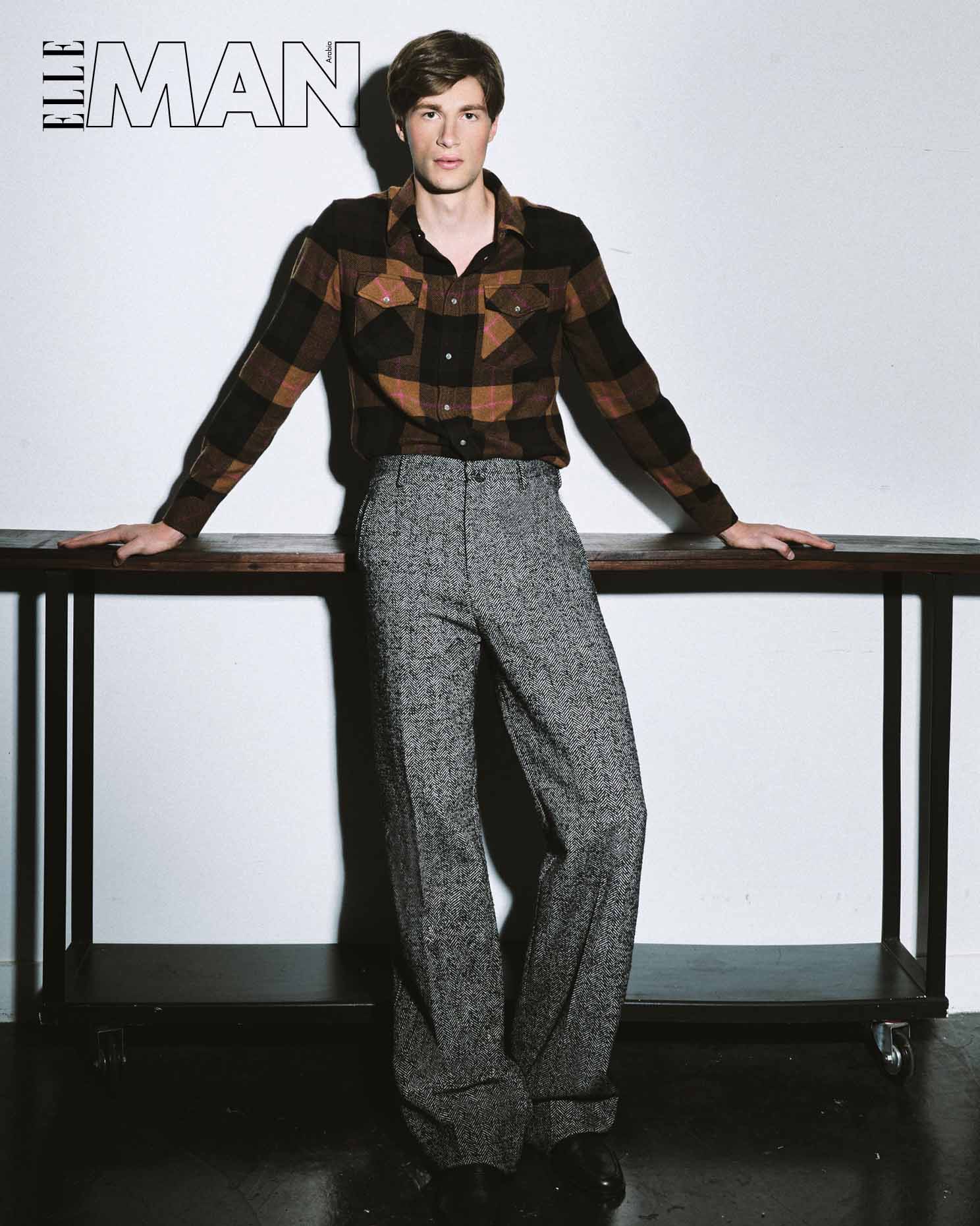 قميص من Eric Bompard؛ بنطلون من Maison Margiela؛ حذاء من Manolo Blahnik