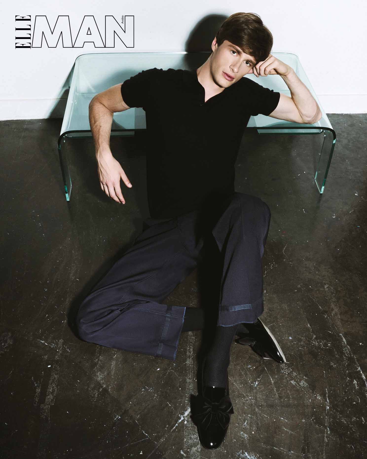 قميص من God’s True Cashmere؛ بنطلون من Lanvin؛ حذاء من Manolo Blahnik