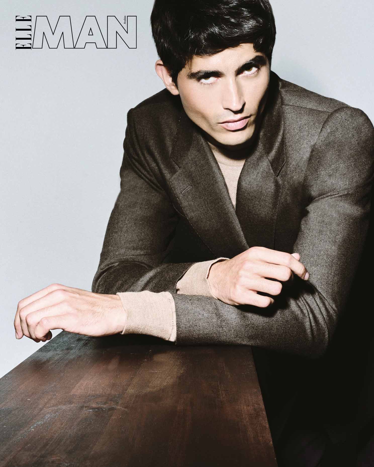بدلة، سترة وقميص من Giorgio Armani؛ حذاء من Manolo Blahnik