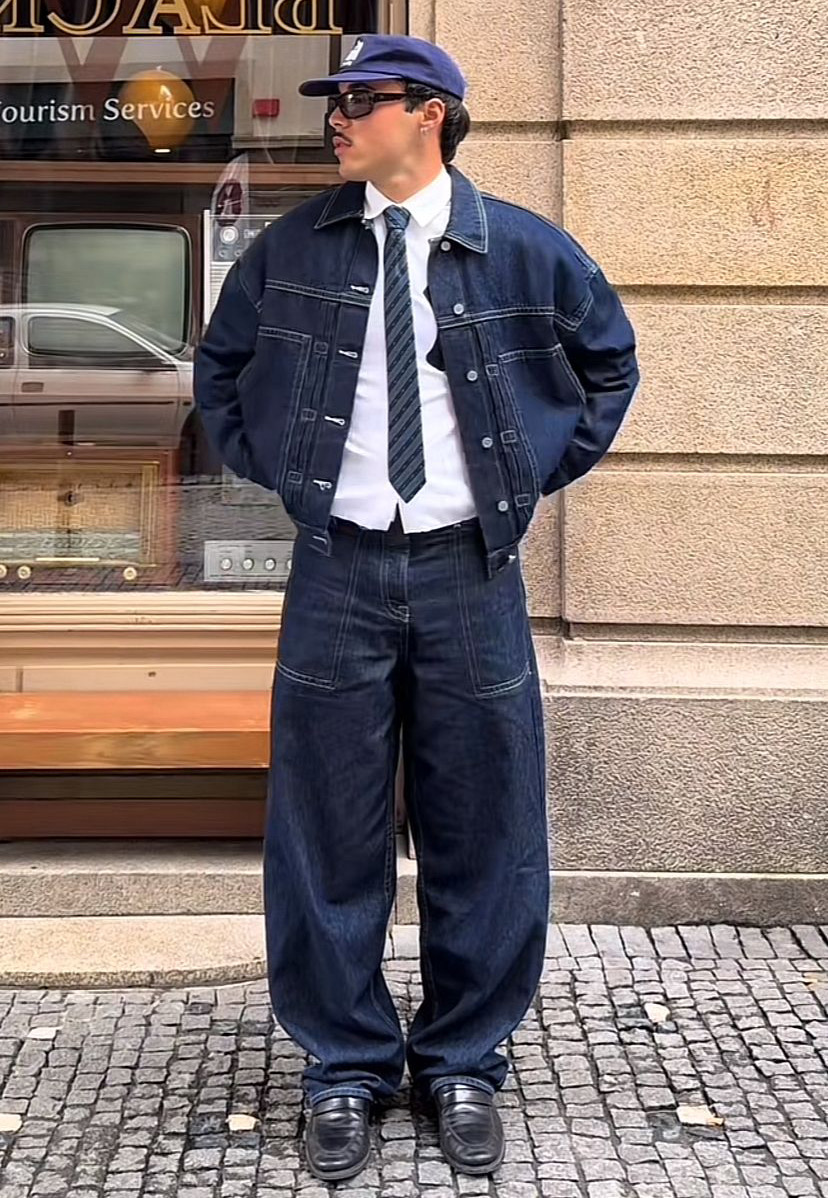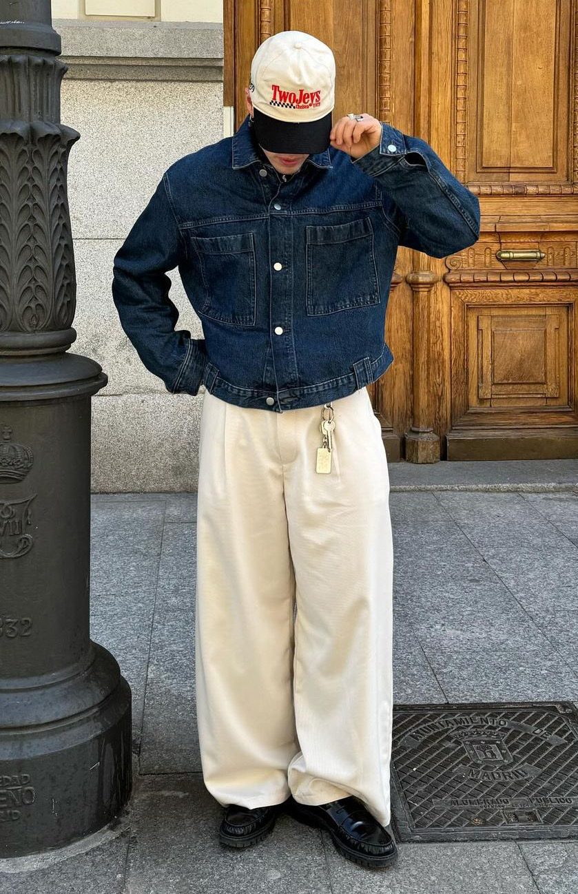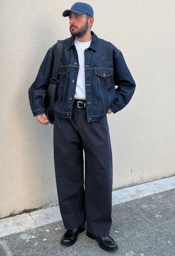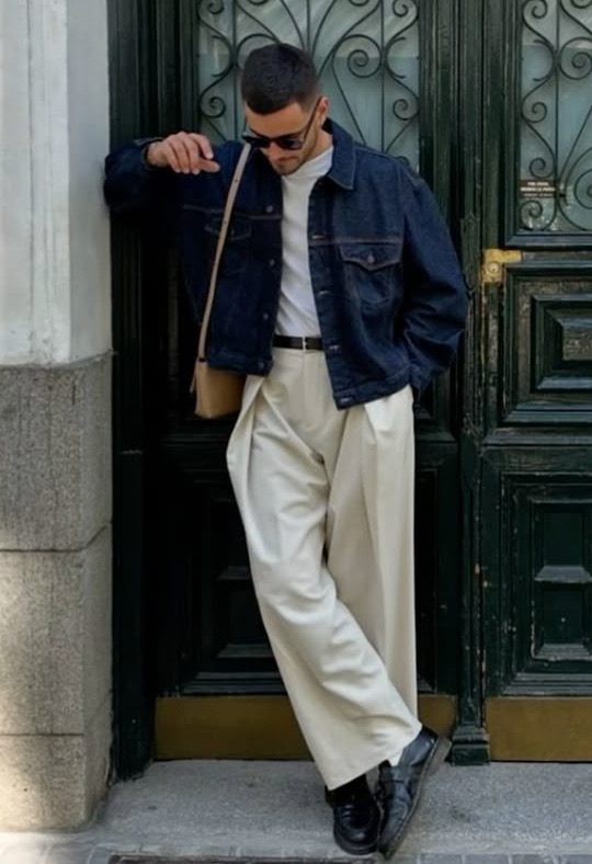 لإطلالة أكثر أناقة، جرّب تنسيق الجاكيت الجينز مع سروال قماش بقصة مستقيمة أو واسعة قليلاً. هذا التباين بين الطابع الكاجوال والقطعة الرسمية يخلق حضوراً قوياً ويعكس ثقة واضحة في الأسلوب. أضف حذاء لوفر أو بوت جلدي لتحصل على لمسة شبه رسمية مثالية للمناسبات غير الرسمية أو العشاء.