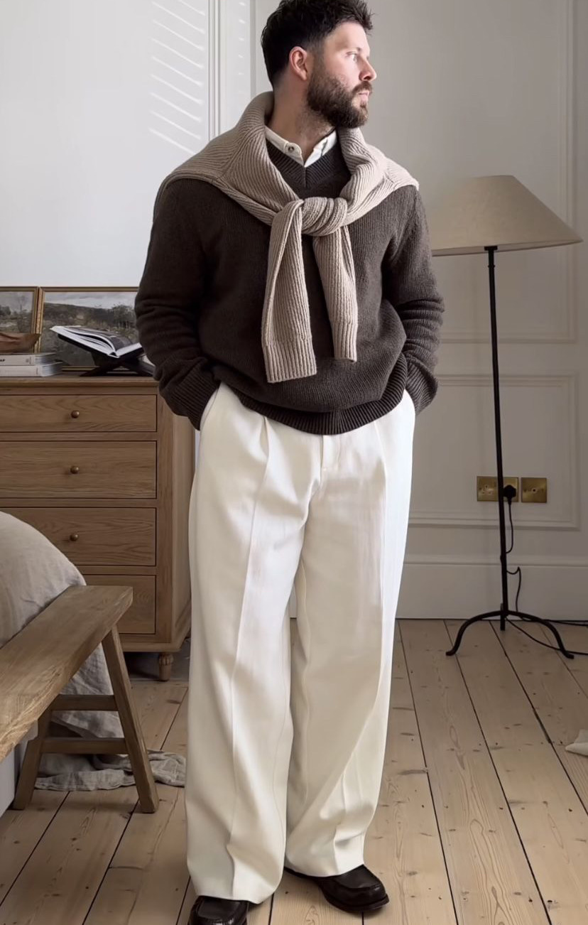 نسّق السروال الأبيض مع معطف الصوفي أو بومبر جاكيت باللون الداكن، واختر لوفر بني بقماش السويد. تنسيق يناسب اللوك الكاجوال أو الكاجوال شيك، ومثالي للخروج في الأيام الباردة مع الحفاظ على الأناقة.