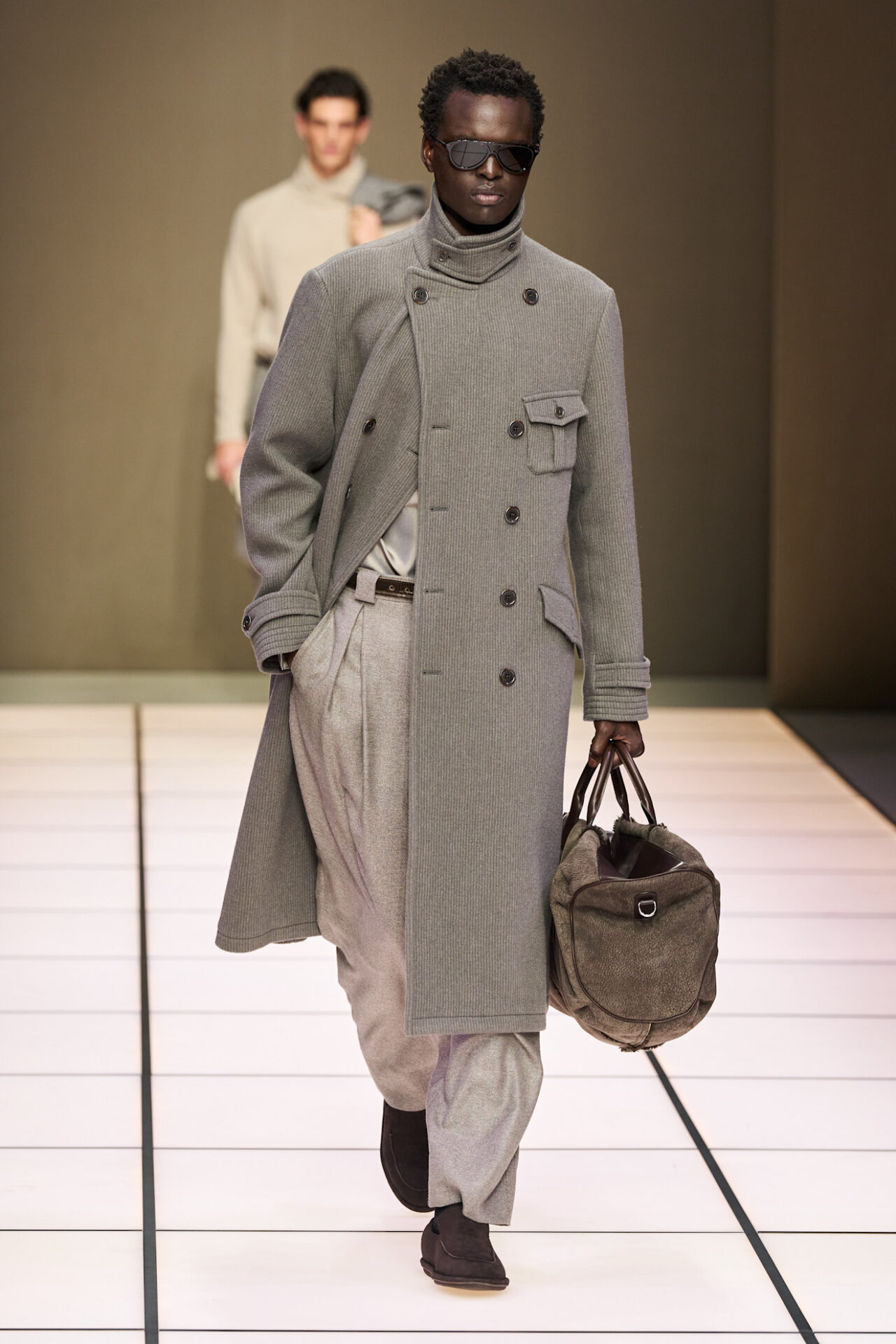 يُعرف جورجيو أرماني Giorgio Armani ببراعته في تصميم الأزياء الراقية، ومعاطفه الشتوية تظلّ رمزًا للأناقة الخالدة. قدّم موسم الموضة الرجاليّ لهذا العام معاطف الكشمير الفاخرة التي تُبرز المهارة الحرفية والتصميم المتقن. يتميز المعطف بقصّته الأنيقة التي تضفي مظهرًا راقيًا، كما أنّه يوفر الدفء والراحة في الأيام الباردة. يمكن دمج هذا المعطف مع بدلة رسمية أو مع إطلالة كاجوال أنيقة، ممّا يجعله قطعة أساسية في خزانة كلّ رجل يهتمّ بالأناقة الكلاسيكية التي لا تفقد بريقها مع مرور الزمن.