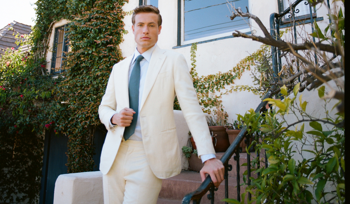 وتتألق السترة المصنوعة من الكتان باللون الأزرق السماوي بجاذبية مستوحاة من خمسينيات القرن الماضي، فيما تعكس البدلة الحريرية البيضاء بنقشة “هيرينغبون” روح الثمانينيات على طريقة “فايس سيتي”.